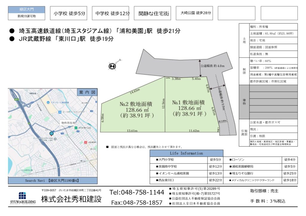 緑区大門【土地】 __ 緑区大門【土地】 住居表示緑区大門1180番4 交通埼玉高速鉄道線(埼玉スタジアム線) 「浦和美園」駅徒歩21分 JR武蔵野線「東川口」駅徒歩19分 土地【所在地番】 【地目】 宅地 【地積】図面参照 建物【用途】 【構造】 【延床面積】 【築年月日】 【現況】 道路図面参照 公法制限【用途地域】第1種中高層住居専用地域 【防火地域】 【建ぺい率】60% 【容積率】200% 【都市計画区域】市街化区域 価格